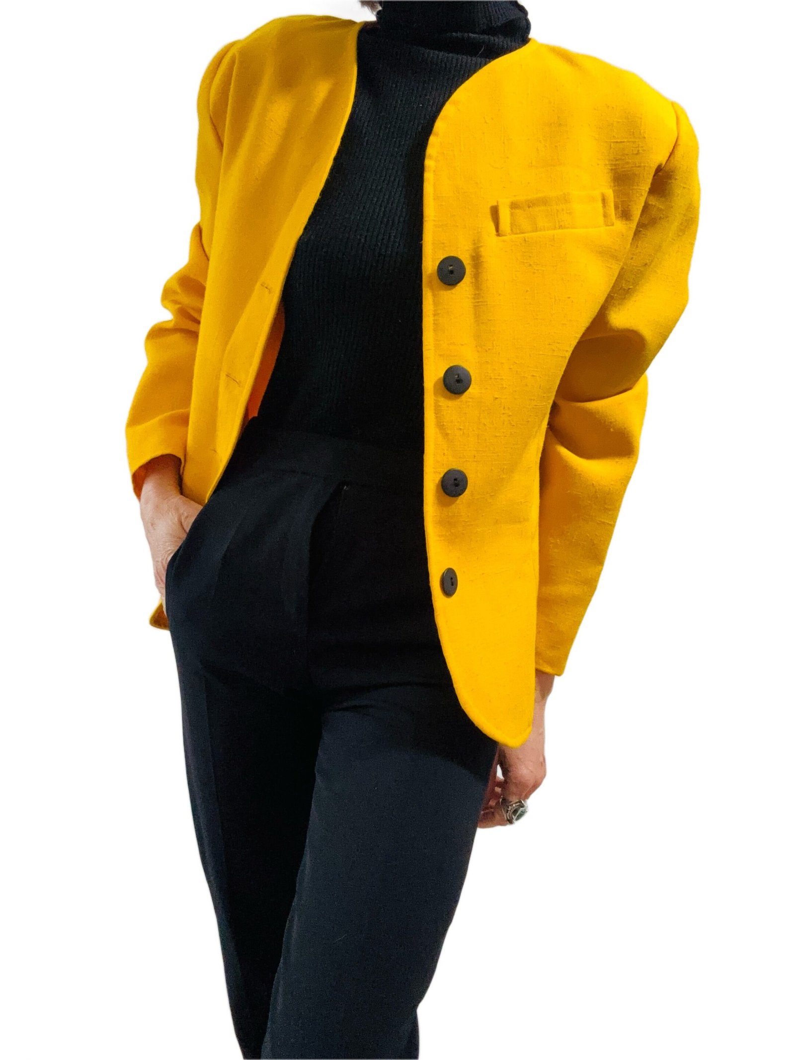 Veste Vintage chic Magnifique jaune tournesol ! Longueur 63 cms Épaule à épaule 41 cms Aisselle à aisselle 50 cms Indiqué taille 40 ( bien 48/40 suivant l’effet désiré